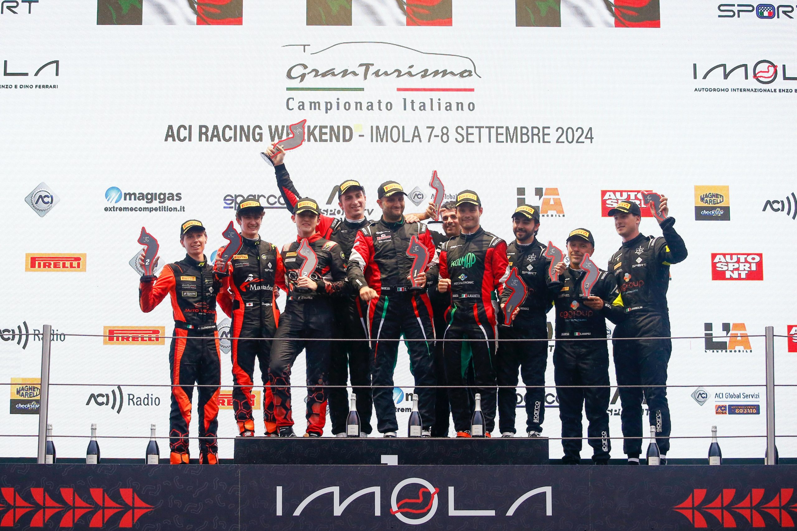 Invictus Corse conquista il suo primo podio, nel Campionato Italiano Gran Turismo Endurance, classe AM, all’Autodromo Enzo e Dino Ferrari di Imola. L’equipaggio composto da Andrés Méndez – Edoardo Barbolini – Giovanni Anapoli ha dato prova di lucidità, segue freddo e di concentrazione a bordo della nuova Lamborghini Huracan Super Trofeo Evo2 #207 nonostante la forte pioggia abbattutasi sul tracciato del Santerno, a pochi minuti prima dello start di gara. Condizione meteo che ha compromesso l’intera manche con ben due le bandiere rosse con ripartenza all’attivo, una lunga sosta in pilane con relativa riunione dei team manager prima di riprendere la corsa, numerosi incidenti, Safety Car e Full Course Yellow, tanto da portare la direzione gara a interrompere la corsa al 104° minuto a causa della pista impraticabile. Nonostante un piccolo testacoda alla Curva delle Acque Minerali e un intoppo in un cambio pilota, la squadra di Maranello è stata consistente e determinata nel raggiungere e conquistare il terzo posto, sotto alla bandiera a scacchi, ed il primo podio assoluto di categoria al primo anno di debutto. Un risultato frutto di un nuovo organigramma della squadra che ha portato maggior sinergia e performance fin dalle prime libere del venerdì. Sabato nelle FP3, infatti, Invictus Corse centra il primo crono di categoria, in 1’45.996s, salvo poi non riuscirsi a ripetere nella sessione di qualifica del pomeriggio, siglando il tempo di 5’18.077s nella sommatoria dei tre turni, chiudendo con il secondo crono e con altrettanto entusiasmo. Il podio di Imola ripaga dell’impegno profuso dell’intera squadra e regala morale dopo due round di inizio stagione particolarmente difficili, dando prova di un potenziale ancora tutto da esprimere.