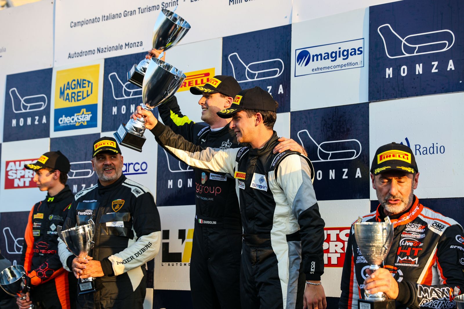 Invictus Corse debutta a Monza e vince. Alla sua prima gara del Campionato Italiano Gran Turismo Sprint AM, la squadra di Maranello trionfa sul circuito lombardo con Edoardo Barbolini e Giuseppe Forenzi, esordiente assoluto nella categoria GT, al via della Lamborghini Huracan Super Trofeo Evo2 #207. Un traguardo voluto, bramato e anche inaspettato al primo anno di competizioni di Invictus Corse, con all’attivo solo tre gare Endurance e già un podio sdoganato ad Imola. In un weekend in crescendo, sia Barbolini che Forenzi conquistano il secondo crono di categoria in entrambe le qualifiche, valide per la formazione in griglia di partenza per gara 1 e gara 2, rispettivamente 15esimo assoluto e ottavo assoluto. In gara 1 si sono compiuti solo 7 giri, di cui tre sotto regime di Safety Car, in 17 minuti dallo start. Una manche fin troppo breve, senza possibilità di cambio pilota, interrotta da una bandiera rossa che ha fatto posticipare l’esordio in categoria di Giuseppe e ha lasciato l’amaro in bocca per un risultato mancato, giocato in difesa a fronte della poca visibilità e dei numerosi incidenti. In gara 2 è Forenzi a debuttare a tutti gli effetti in categoria, al suo primo start in schieramento con oltre 30 partecipanti al via. Nonostante l’emozione e l’adrenalina della prima gara, il diciottenne lombardo scatta bene e recupera posizioni importanti, con maturità e consapevolezza del proprio potenziale, in un ritmo serrato che lo porta a conquistare la seconda posizione di categoria. Al cambio pilota è Barbolini a dover mantenere la posizione in pista e a far la differenza sul finale di gara. Un finale da cardiopalma iniziato, dopo una ripartenza dietro la SC, che ha visto Barbolini schivare un incidente in curva 1 – che avrebbe potuto cambiare le carte in tavola – e cogliere il primo posto di categoria, in una gara nuovamente terminata con la bandiera rossa.