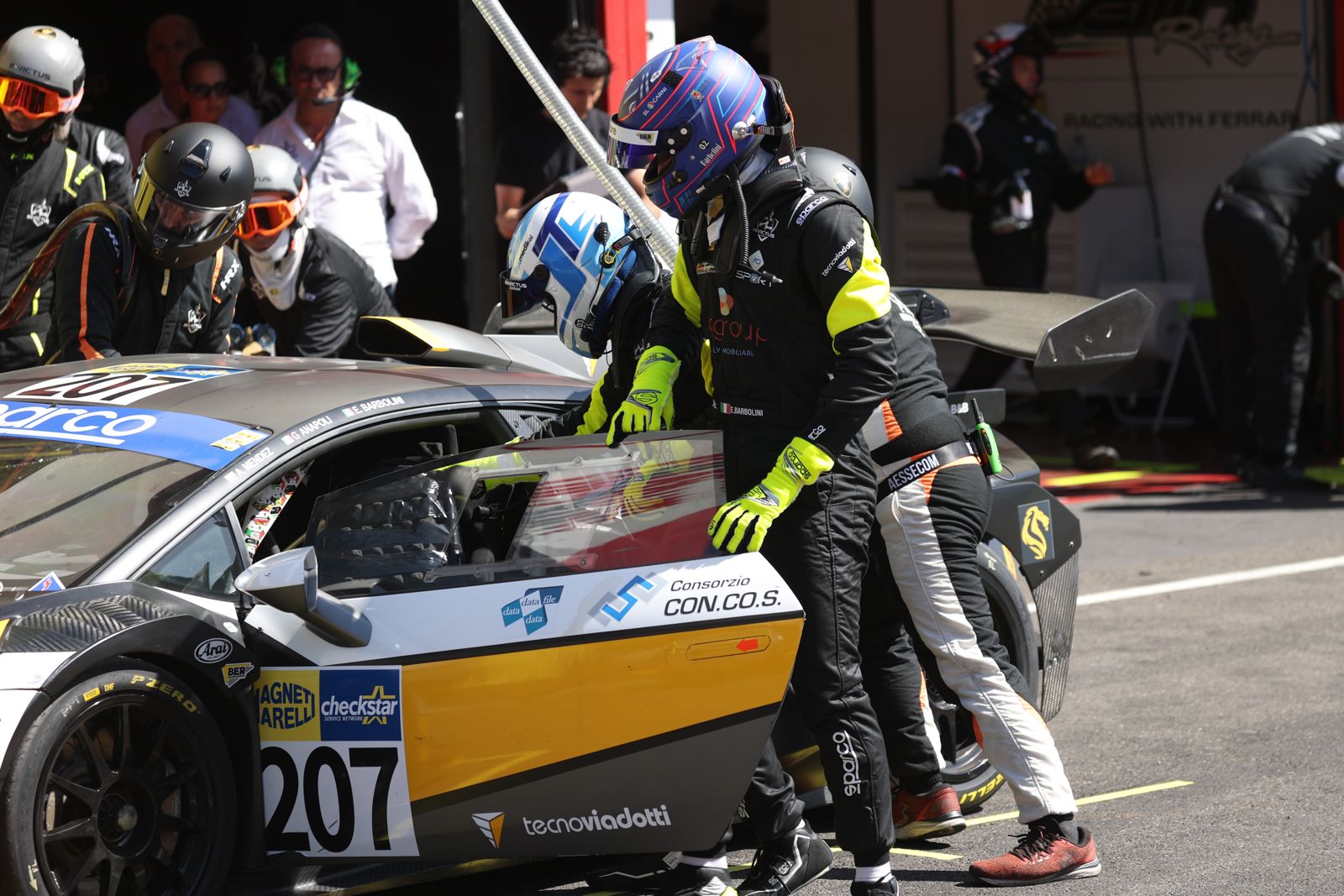 Invictus Corse firma la top5 al secondo appuntamento del Campionato Italiano Gran Turismo al Mugello Circuit. Un risultato che da morale e voglia di migliorare alla squadra di Maranello, dopo uno sfortunato inizio di stagione a Vallelunga. In un weekend in crescendo, l’equipaggio di Alessandro Stancari acquista sempre più feeling a bordo della Lamborghini Huracan ST Evo2 #207, con Edoardo Barbolini, Giovanni Anapoli e Andrés Méndez fiduciosi dopo la giornata di test positiva, conclusasi a Cremona un paio di giorni prima dell’arrivo in terra toscana. Sul tecnico saliscendi del Mugello, siglano il quinto crono di categoria nella comparata dei tre turni di qualifica, con Barbolini impegnato in Q1, Anapoli in Q2 e Méndez a chiudere in Q3. Diversa invece la strategia di gara per dividersi gli stint, con il Méndez allo start in griglia di partenza, Barbolini pronto al primo cambio pilota e Anapoli a chiudere sotto alla bandiera a scacchi. L’affiatamento ed il ritmo di gara simile, hanno permesso alla squadra di Maranello di chiudere in top5 nonostante alcune sfortune e complicazioni tecniche, le numerose safety car e le dinamiche legate al FCY che hanno aumentato le difficoltà e la concentrazione durante la manche, non permettendo di conquistare un miglior risultato. Il round del Mugello è servito alla squadra a prendere confidenza con i nuovi membri del team e con l’arrivo del nuovo Ing. di pista, Manuele Barbieri, che già da diversi anni collabora con Invictus Corse per eventi e attività in pista legati alle sole racing car.